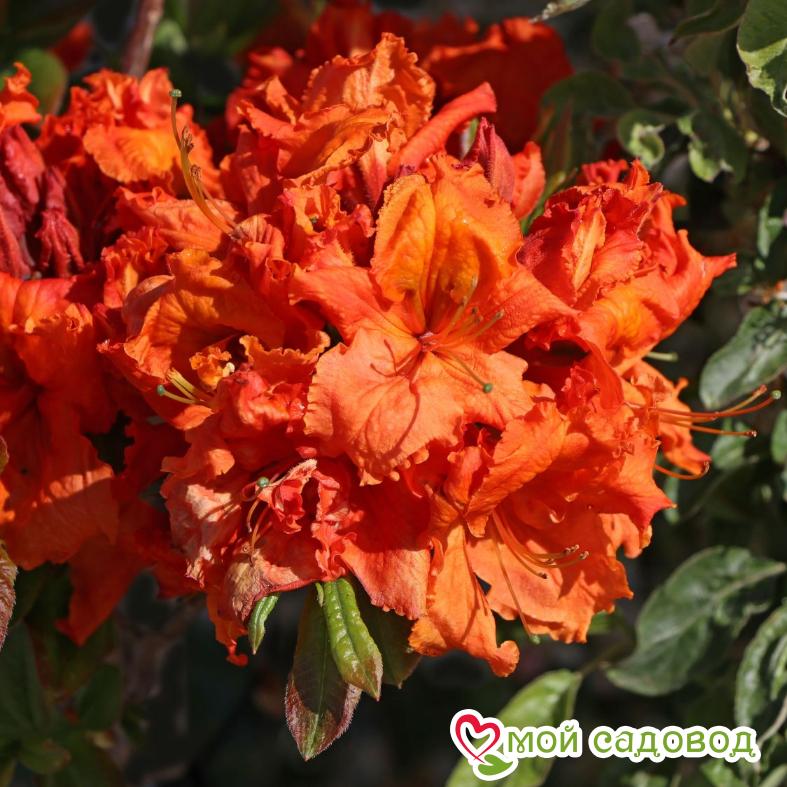 Роскошно цветущий сорт с яркими красно-оранжевыми широко открытыми, воронкообразными цветками. Лепестки с гофрированной кромкой. Верхний лепесток украшен почти полностью оранжево-жёлтым пятнистым рисунком. В соцветии до 10 слегка ароматных цветков. Каждый цветок диаметром 5 см. Цветение в конце мая – начале июня. Куст пряморослый округлый, к 10-ти годам высота 90 см и ширина 70 см, конечная высота 120-150 см и ширина 120 см. Лиственный покров зелёный. При посадке в открытый грунт выбирайте для рододендрона безветренные участки, находящиеся в полутени. Гибрид адаптирован под условия холодных зим и хорошо переносит понижение температур до -30C. Однако из-за особенности корневой системы растение в холодный период нуждается в воздушно-каркасном укрытии. Чтобы цветение было максимально декоративным, вносите комплексные удобрения 2-3 раза за сезон.